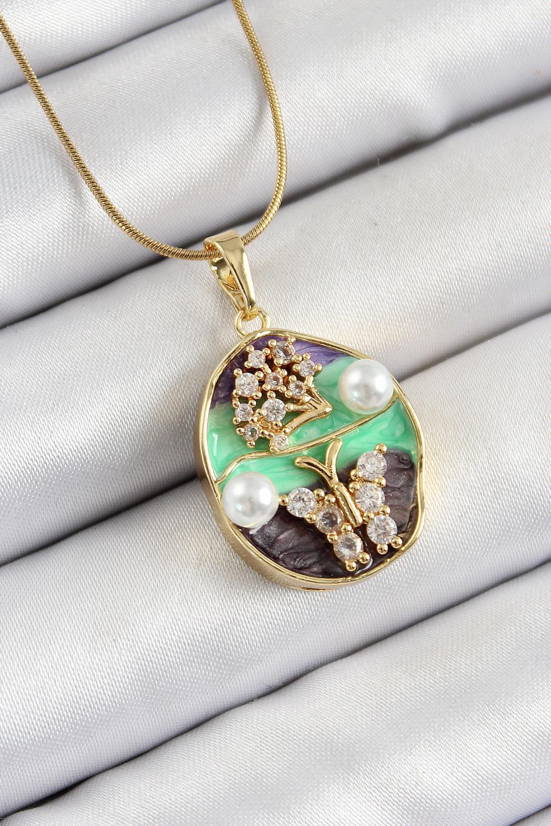 316L Çelik Zincir Zirkon Taşlı Yeşil Mor Sanatsal Portre İnci Detaylı Ağaç Ve Kelebek Figürlü Model Gold Renk Kadın Kolye