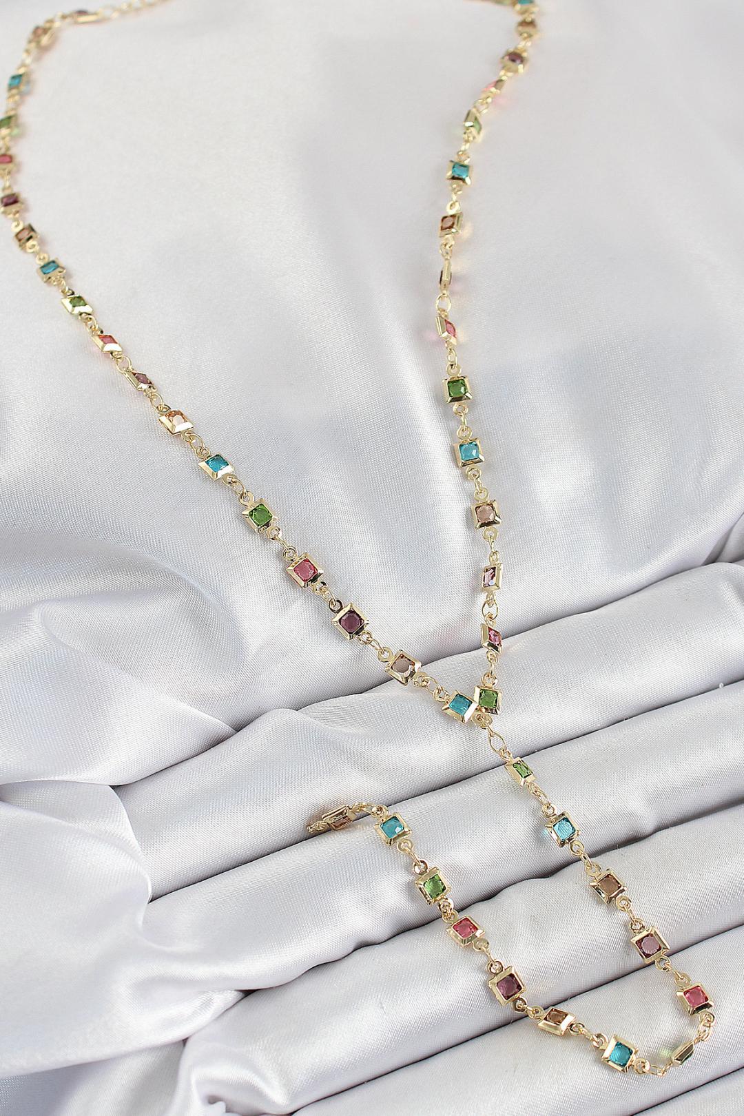 Pirinç Asorti Kare Model Gold Renk Zirkon Taşlı Y Kolye